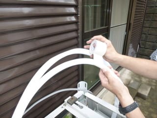 配管パイプに化粧テープを巻ききれいに仕上げていきます。今回使っているテープは粘着タイプ(ビニルテープのようなもの)で紫外線に強いのですが、お引越しなどにはきれいに剥がしにくいので不向きですね!持家のかたやエアコンのお引越しをされないかたには向いております。