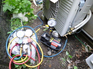 左側の写真は真空ポンプでの作業の写真です当社では真空ポンプは必ず行います。右側の写真は真空ゲージで、真空状態を細かい数値で見ることができます。この作業がとても重要になります。室外機にもアースの取付をして完成です。Y様お買い上げありがとうございました。