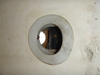 古いエアコン外してみたらあら!びっくり!穴の後ろは水道管でした!少し斜め後ろの穴が外の穴です。