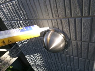 その後外部フードの周りにコーキングを付けヘラなどできれいに伸ばしながらフードに密着させます。