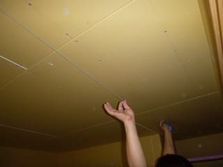 今日の現場は鎌倉のお宅です。壁紙を張る前にスイッチやコンセントの場所を切り込みする作業をしに伺いました。照明器具はダウンライトが多かったのでチョークタイプの墨つぼでライン付をして、照明がづれないように作業しております。