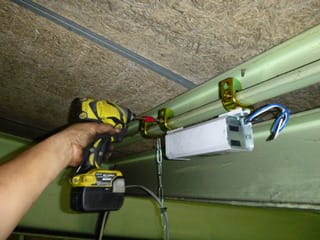 仕事自体は天井付近での作業ですからおおよそ9m付近ですね。落ちないようにしっかり留めております。水銀灯タイプの照明器具を倉庫に応じて高さを調整して出来上がりです。今回は4台取付いたしました。その工事と一緒に蛍光灯の球替えも作業させていただきました。いつもご依頼ありがとうございます。また、宜しくお願いいたします。