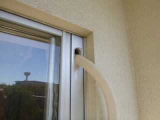 エアコンの穴がないので専用の部材を用意して取付いたしました。写真には写っていませんが、最後に配管が貫通した部分をパテ(ねんどのようなもの)でふさいでおります。