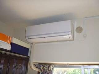 エアコンの穴がないので専用の部材を用意して取付いたしました。写真には写っていませんが、最後に配管が貫通した部分をパテ(ねんどのようなもの)でふさいでおります。